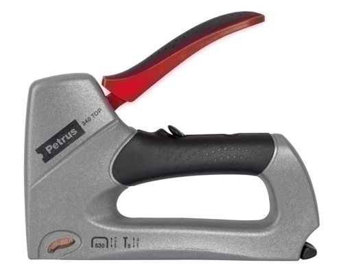 Clavadora metálica ligera y potente con gran capacidad, para grapas 530/6-8-10-12-14 mm (patas 8 a 15 mm), tiene regulador de potencia y función de bloqueo sin retroceso. Apropiada para sujetar tejidos, lienzos, piel, carteles, mallas, rótulos, etc...